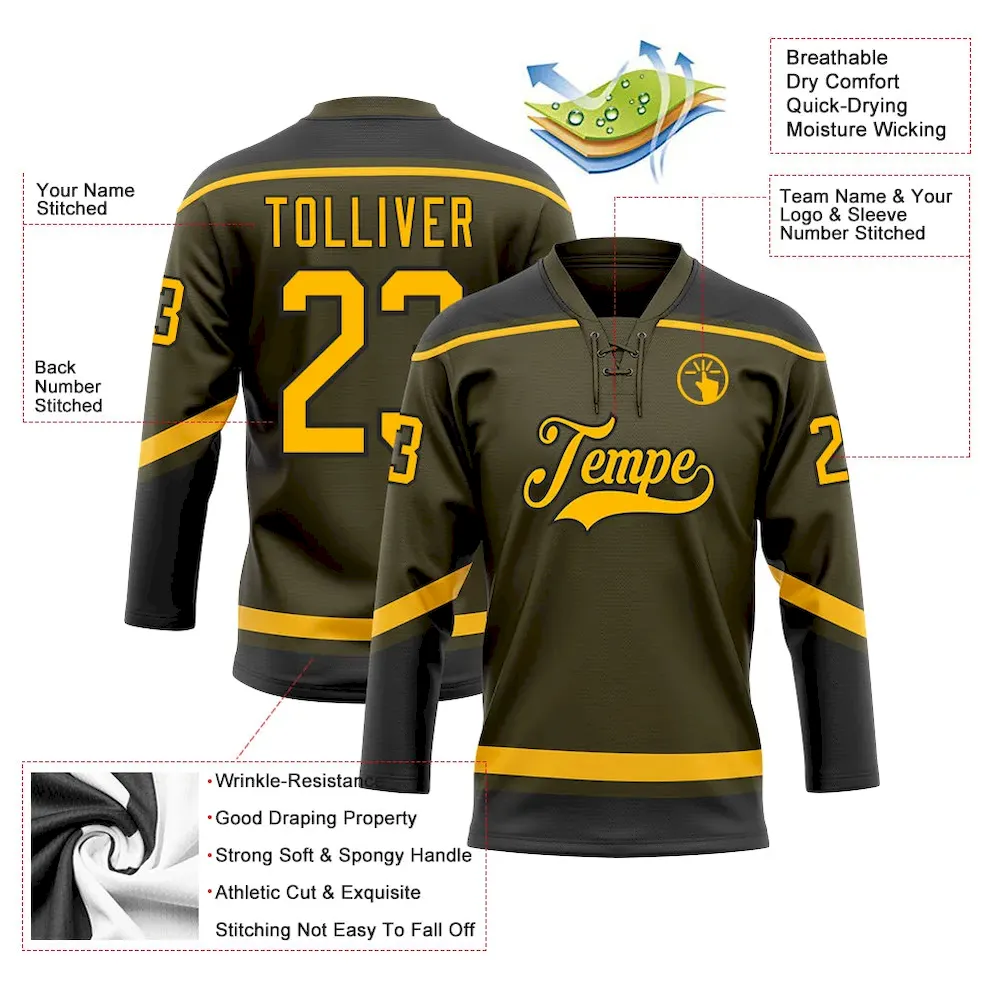 Be the first to review “Custom Olive Gold-Black Salute To Service Hockey Lace Neck Jersey” Cancel reply